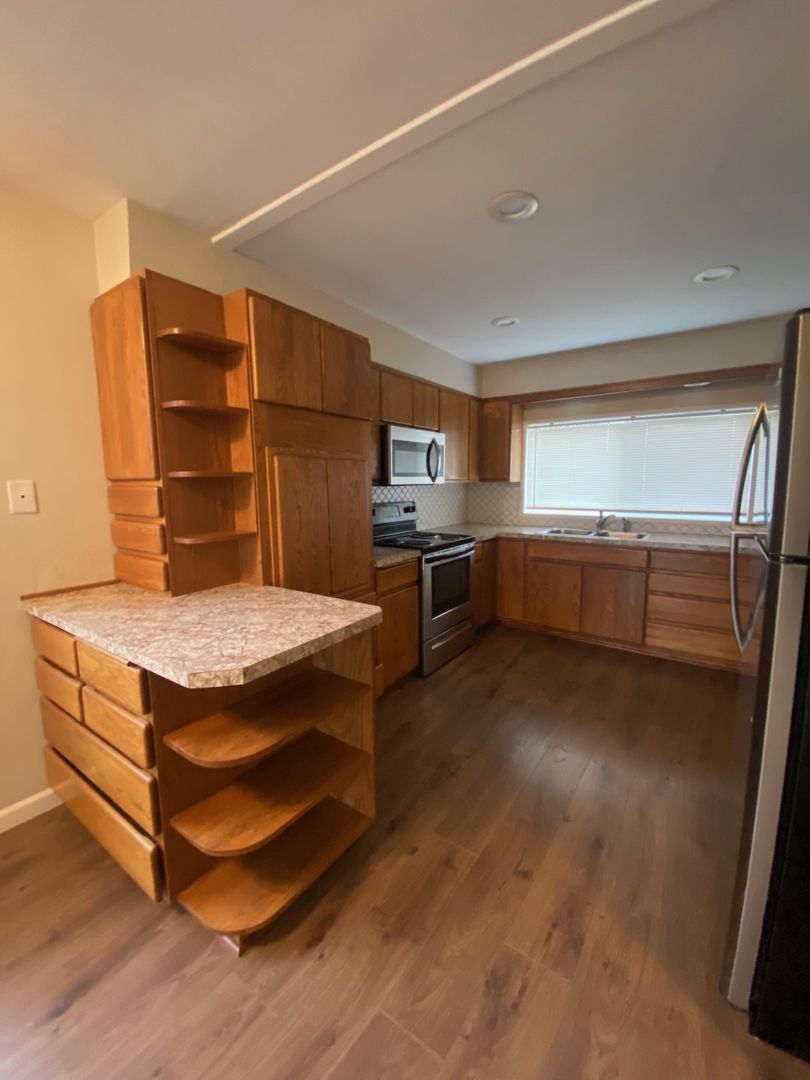 This updated two-bedroom duplex has so much to offer! It has a large kitchen with stainless steel appliances, quality cabinetry and plenty of storage. You'll find beautiful luxury vinyl flooring and modern paint throughout. Out back there is a single car garage facing the alley for private entry, plus additional covered space for your storage needs. This unit is located close to downtown shopping, and the bus line making it convenient for all.